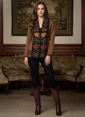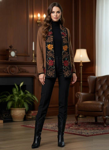 Elegant reversible alpaca sweater featuring warm earth-tone florals and intricate jacquard detailing. Crafted from soft, lightweight alpaca fibers, it offers a refined drape and versatile styling, with one side showcasing bold floral accents and the other a more subtle pattern. Perfect for adding artisanal sophistication to both casual and dressy looks.