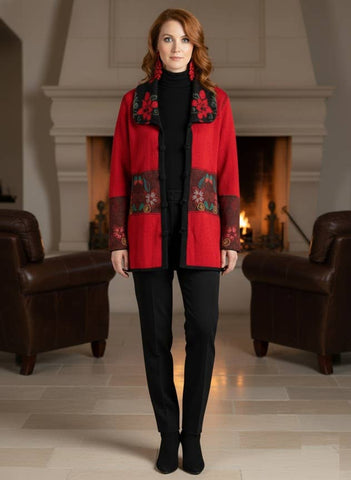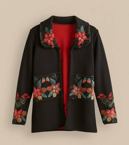 The two-in-one design makes it perfect for travel and layering, easily adapting from casual to more refined settings. Each side often features a different color combination of beautiful floral jacquard knit pattern.