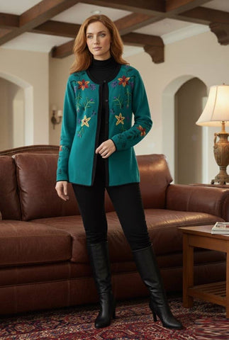Elegant reversible alpaca sweater featuring exquisite floral embroidery on both sides. Crafted from luxurious baby alpaca fibers, it offers exceptional softness, warmth, and lightness. One side displays a deep black background with vibrant multicolor flowers, while the reverse showcases a rich turquoise tone for a fresh, versatile look. Perfect for travel or everyday elegance, this reversible piece combines artistry and comfort in one timeless design.