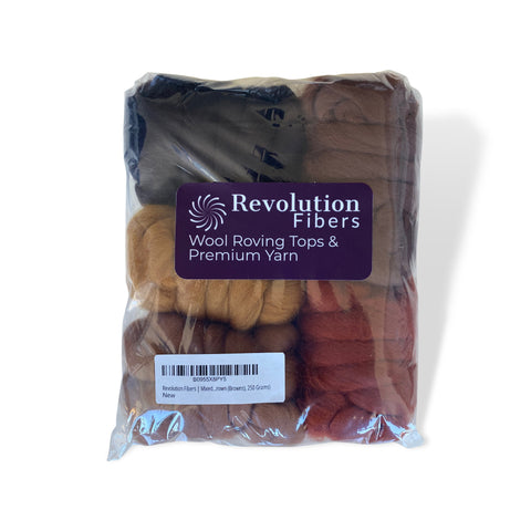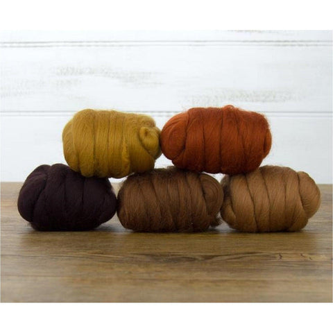 The Barky Browns pack is a 250 gram, 5 color bundle of 22 micron, premium grade merino wool top.