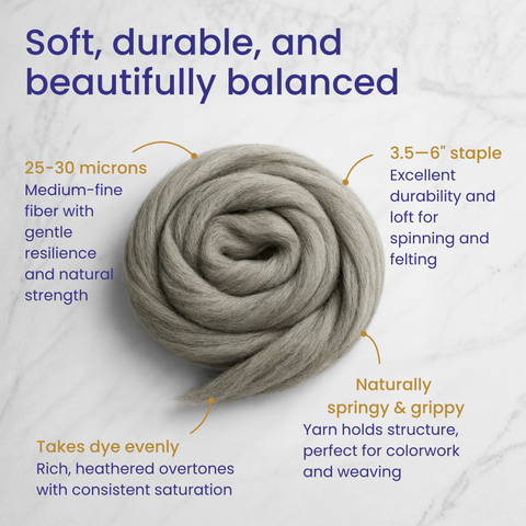 With a micron count between 25–32 µm and a staple length of 3.5–6 inches (80–150 mm), this Corriedale top sits comfortably in the soft-medium range—gentle enough for outerwear yet sturdy enough for high-use projects like blankets, rugs, and bags. Its medium crimp provides bounce, body, and elasticity in the finished yarn, helping your creations retain shape while maintaining a soft hand.