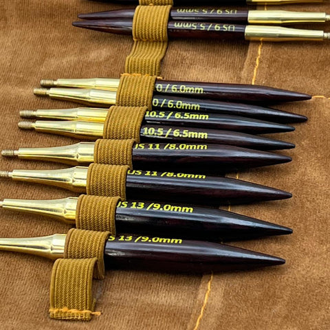 When you buy The Revolution Fibers 3.5", you’re getting 10 beautifully grained, hand polished interchangeable tip sets containing needles size US #4 to US #13, plus 4 connecting cords ranging from 15.75” to 31” for larger items and 4 carved rosewood end caps.