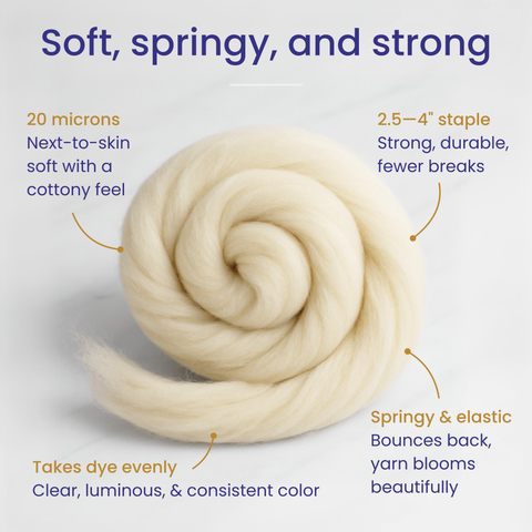 - Structured to spin well: Square, matte fibers with a defined crimp make this wool naturally cohesive and predictable to work with.