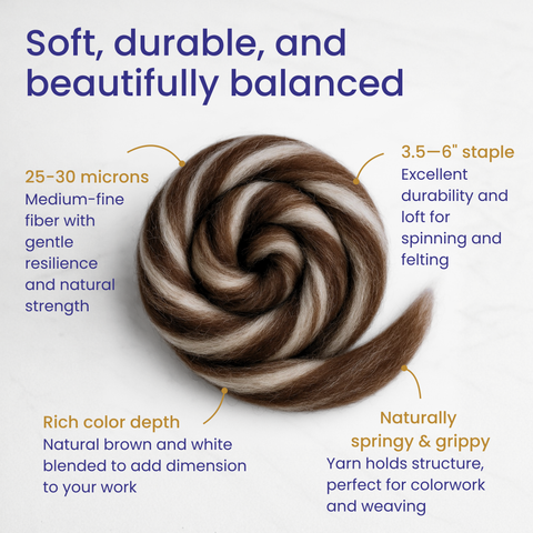 Each strand of Yin Yang Corriedale showcases a seamless twist of undyed natural brown and natural white (ecru) fibers. The result is a beautifully marled top with spontaneous patterning that spins into unique yarn every time — no two skeins alike. The contrast creates instant depth and texture without the need for dyes or colorwork, letting nature’s palette do the talking.