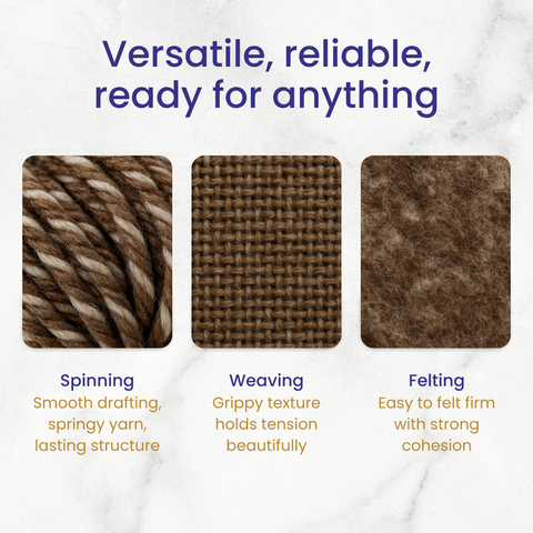 For Felting: Its medium micron count and natural “grip” make it a favorite for both needle and wet felting. The dual tones can be manipulated for shading, realistic effects, or organic surface patterns — especially in sculpture or felted landscapes.